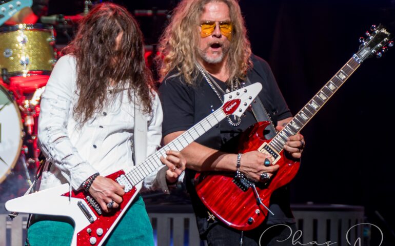 Judging by the amount of red, white and blue adorned middle aged gals in Poison shirts, it was evident that most came to witness the headliner, Bret Michaels. Hell, there were even several guys of a similar age that strutted around as if they were Bret’s stunt double. You know, curled cowboy hat with studs or patches, sleeveless self-promo Poison tee, overly tight stonewashed denim and the just past the shoulder, flat ironed tresses. Whether they were real coifs or not remains to be seen, not unlike Mr. Michaels himself. Regardless of what remaining follicles may be intact wasn’t important, love him or hate him Bret Michaels comes to make sure everyone is part of the party. On this particular fest, it would aptly be named Live and Amplified Parti Gras Tour, with palm tree adorned sets and digital imagery that would make any Daytona Spring Break proud. As mentioned, Michaels’ soul purpose seems to be making sure everyone is pumped up and as energetic as he is. Apparently one way to make sure, and magically conjure said enthusiasm, is by pointing at each and every person in the audience. And if you’re “lucky” enough to be down in front, you may even get a high five, fist bump or even a special bro hand shake. The band backing him is along for the ride and almost as actively animated as their CEO, and I’ll add, very talented musicians. His set leaned into the party atmosphere—big hooks, sing-along choruses, and that carefree rock-and-roll vibe he’s built his career on. From openers, a Poison trio, “Talk Dirty to Me”, “Ride the Wind”, and “Look What the Cat Dragged In” to covers “Your Mama Don’t Dance” and “Sweet Home Alabama”, the band and Mr. Michaels were nonstop. One song seamlessly lead into the next. “Unskinny Bop”, Something to Believe In” and the obligatory sing along ballad “Every Rose Has its Thorn”. We may have dodged the bad weather bullet this time, but there were very few in attendance that avoided Bret’s outstretched index finger. And as his show closing number states, and he makes clear with each performance, he’s looking to spread “Nothin’ But a Good Time”.