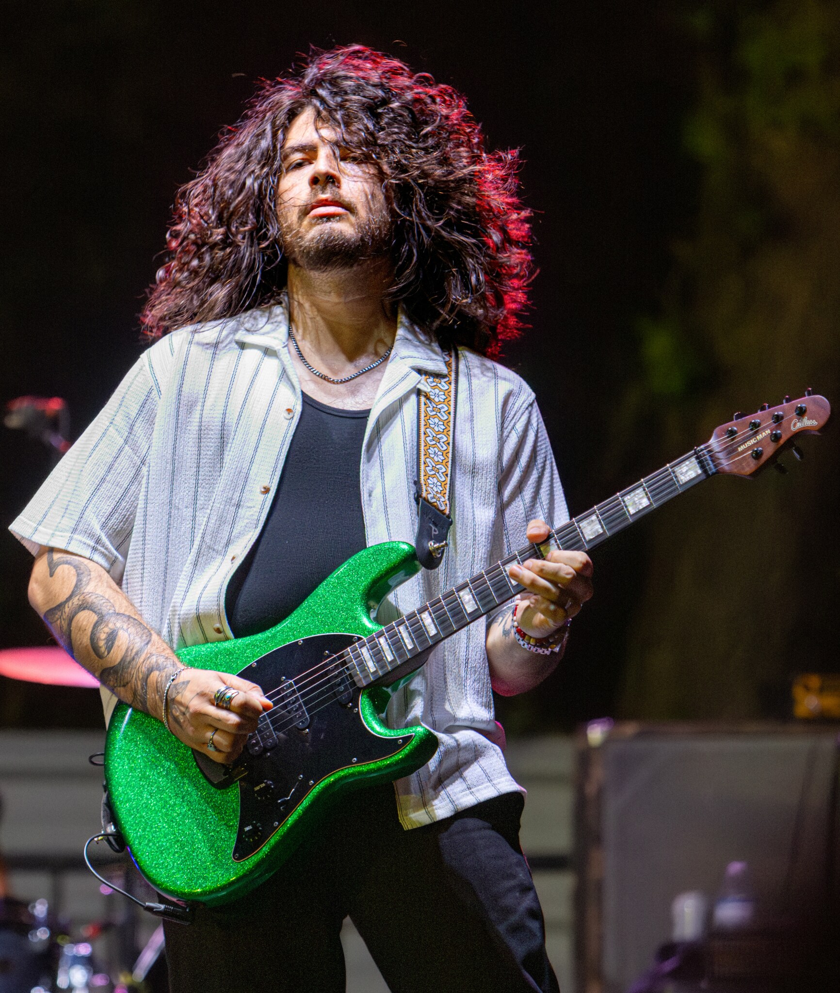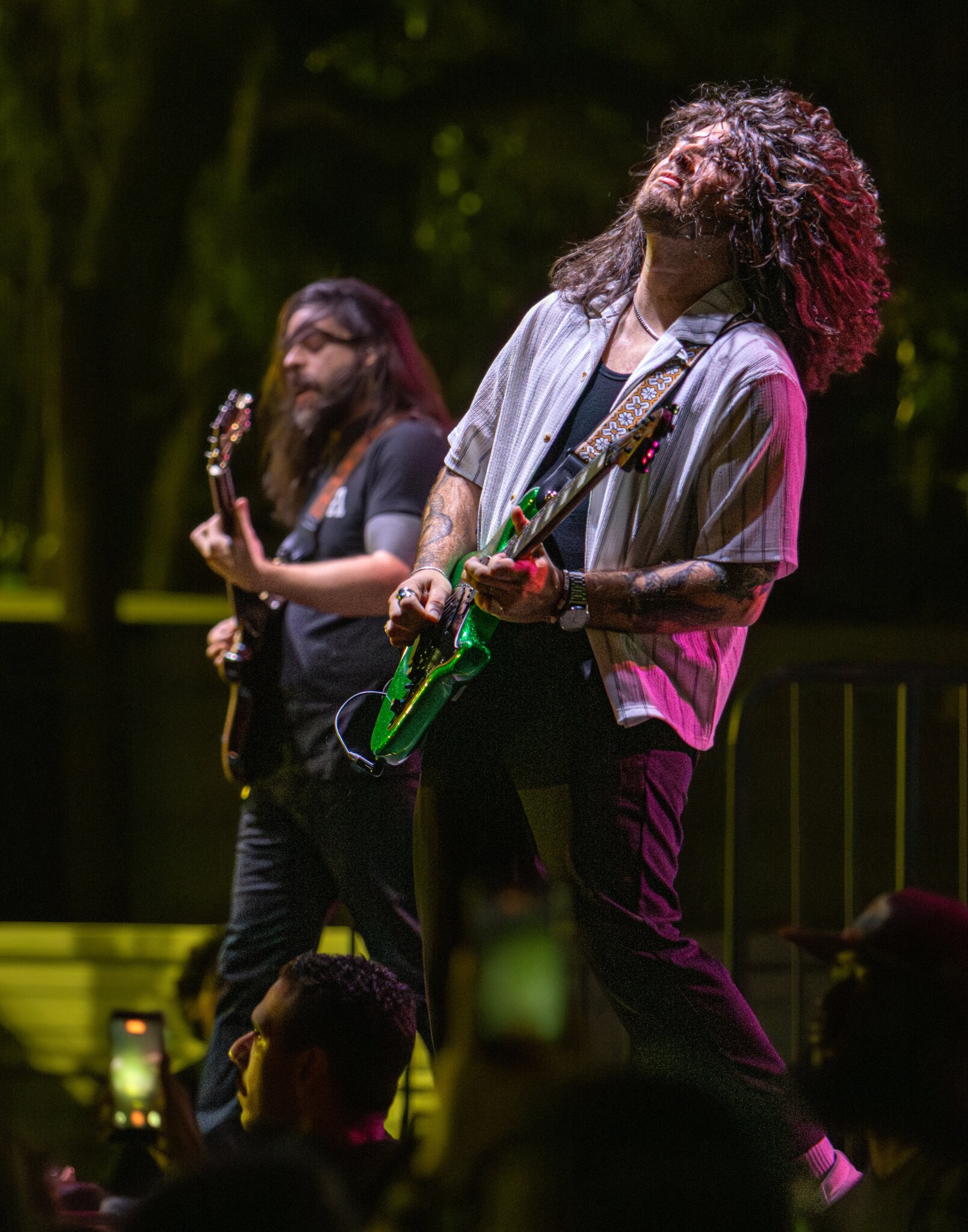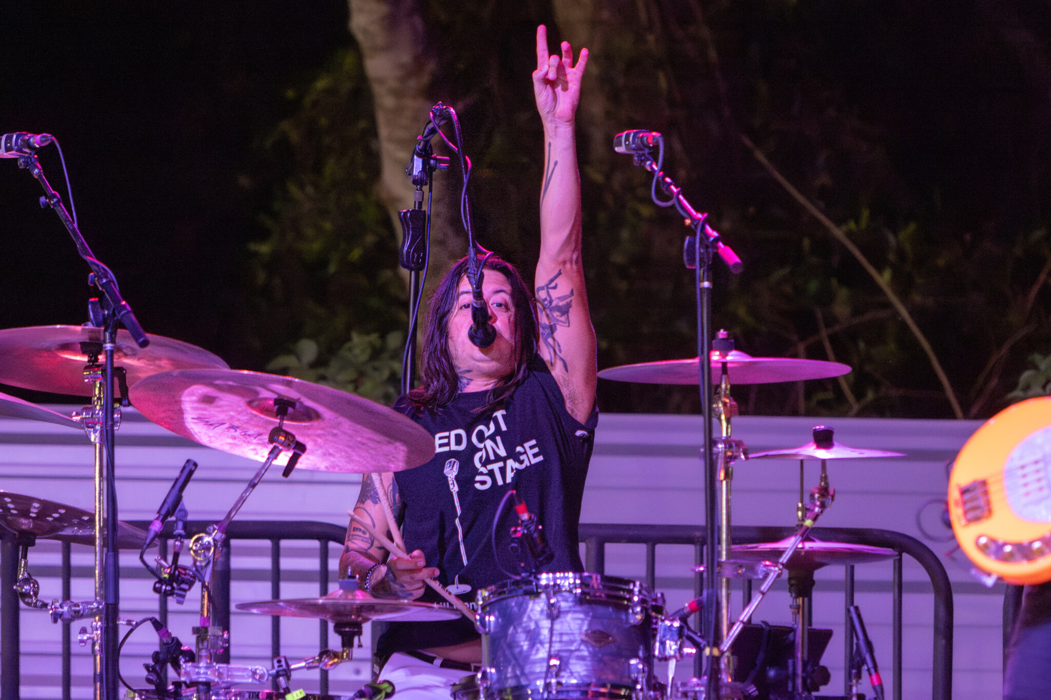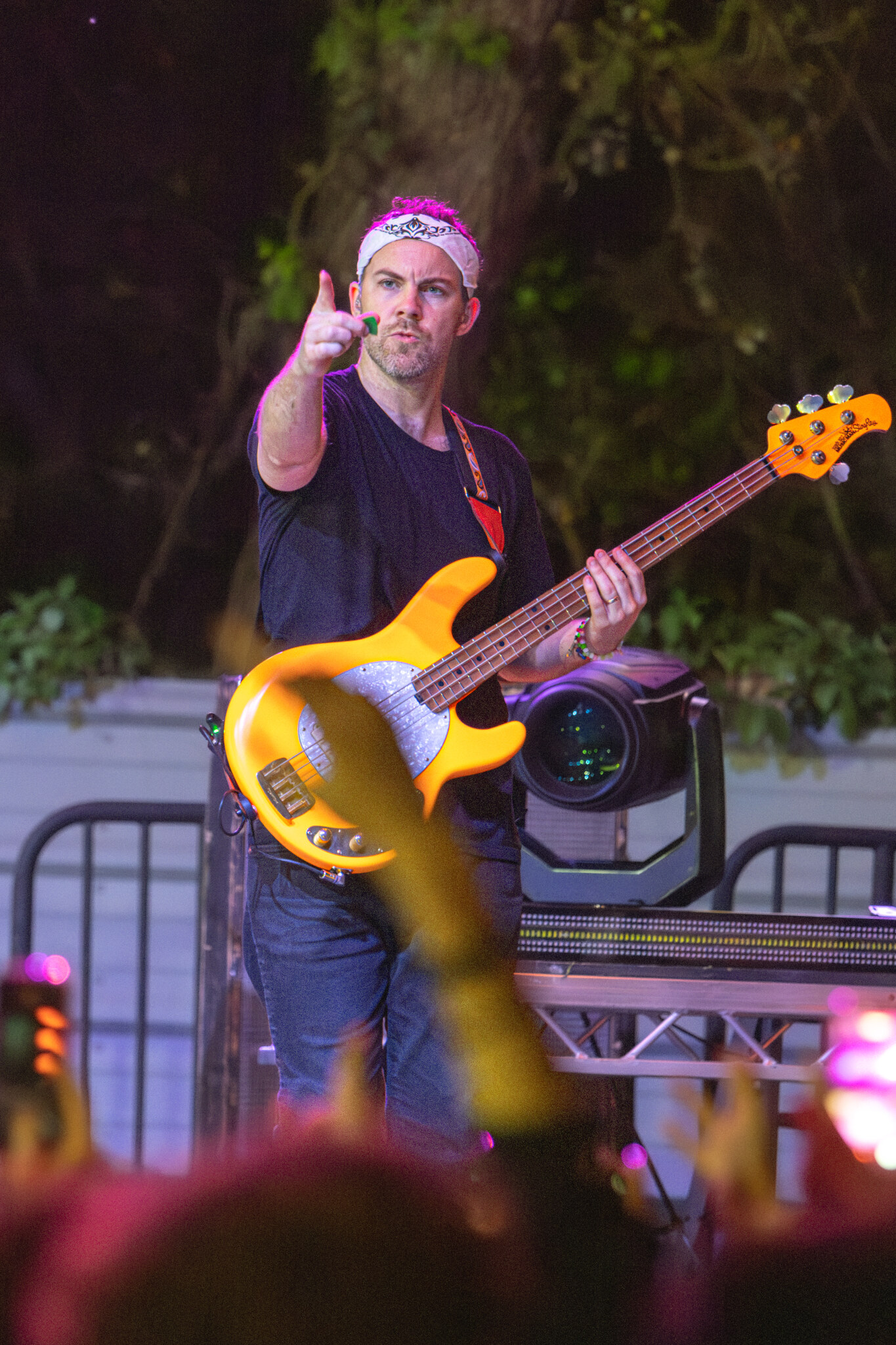 On the other side of the stage, Sky stood atop his keyboard while still playing with his feet and at one point went out into the crowd, still playing, while supported by fans. Devin’s chin served as his guitar’s balancing beam when he removed his jacket mid-set. At the back of the stage, Teddy kept the beat going even when standing up behind the set and coordinating playful interactions with Eric. The band’s message of love, friendship, and togetherness was perfectly catered to the fans in this crowd.