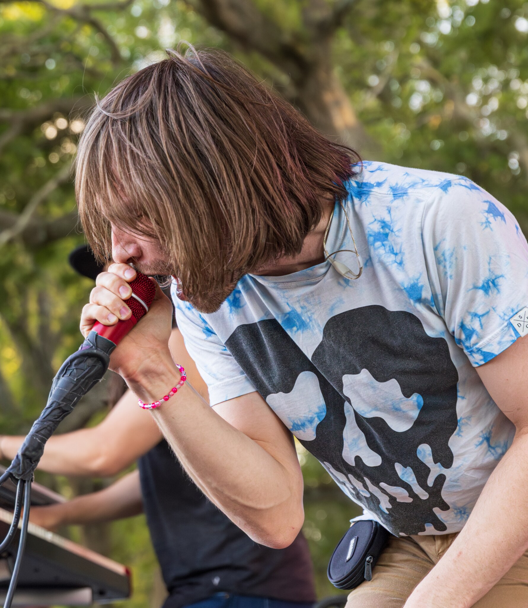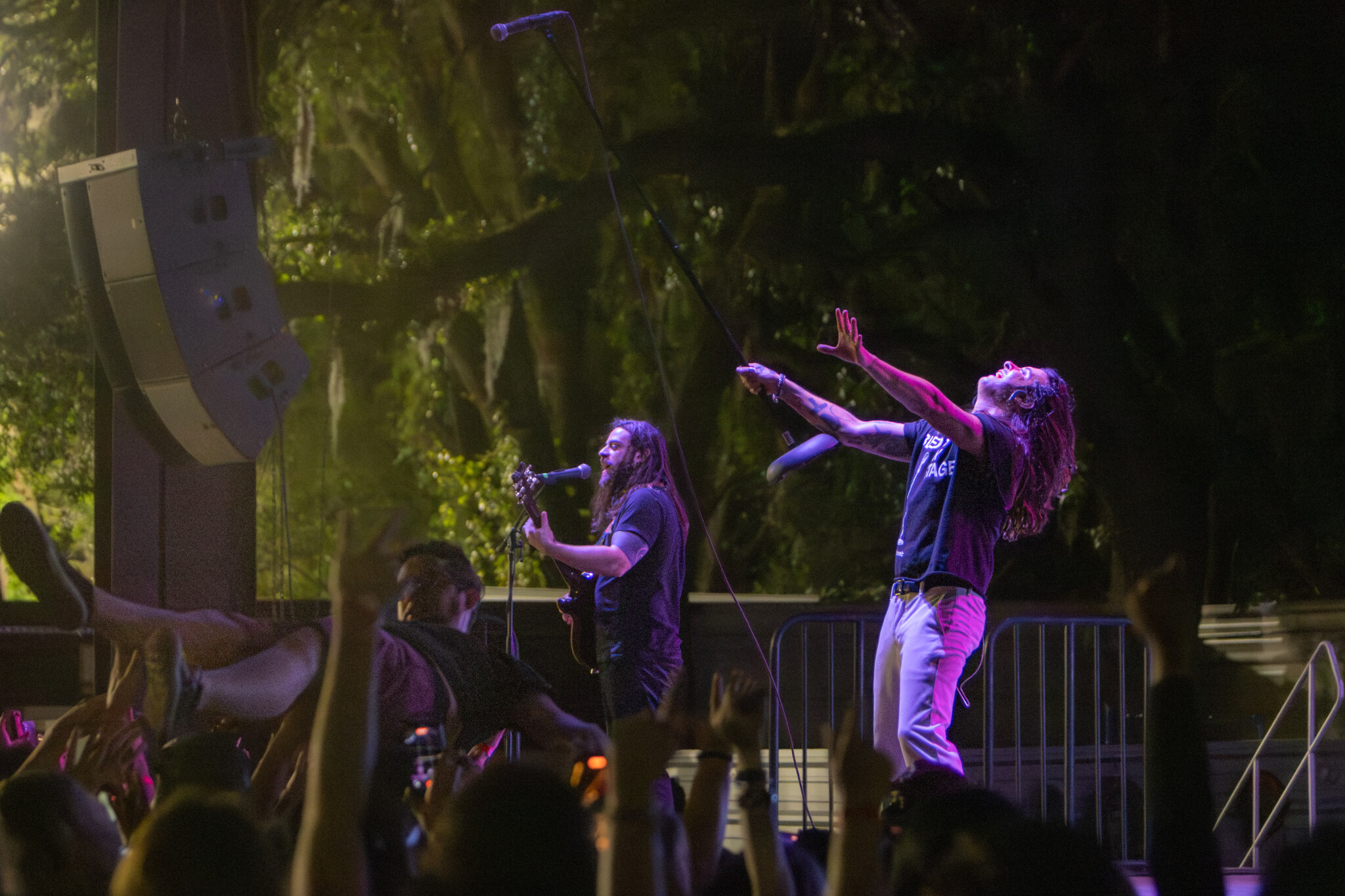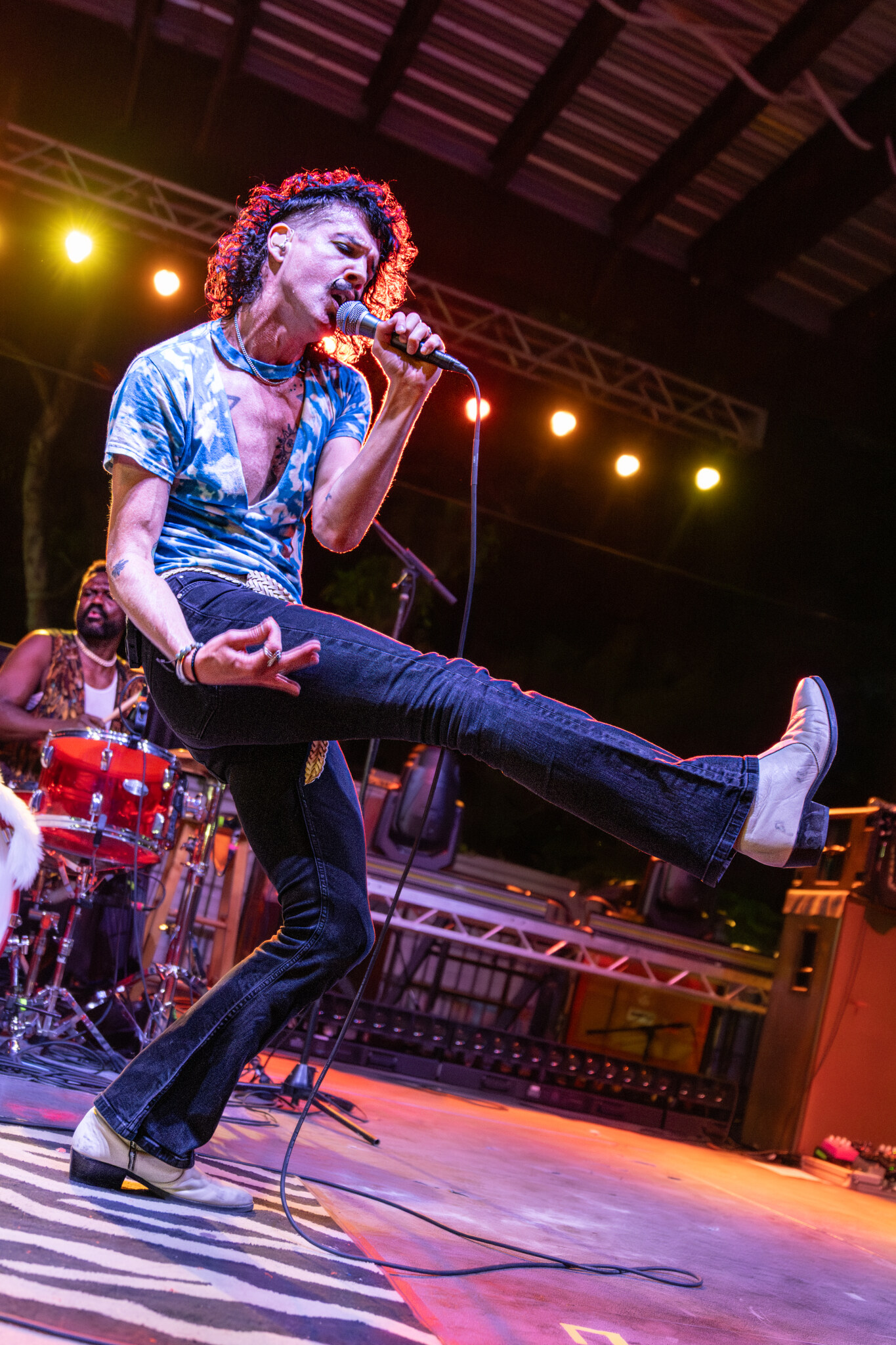 On the other side of the stage, Sky stood atop his keyboard while still playing with his feet and at one point went out into the crowd, still playing, while supported by fans. Devin’s chin served as his guitar’s balancing beam when he removed his jacket mid-set. At the back of the stage, Teddy kept the beat going even when standing up behind the set and coordinating playful interactions with Eric. The band’s message of love, friendship, and togetherness was perfectly catered to the fans in this crowd.