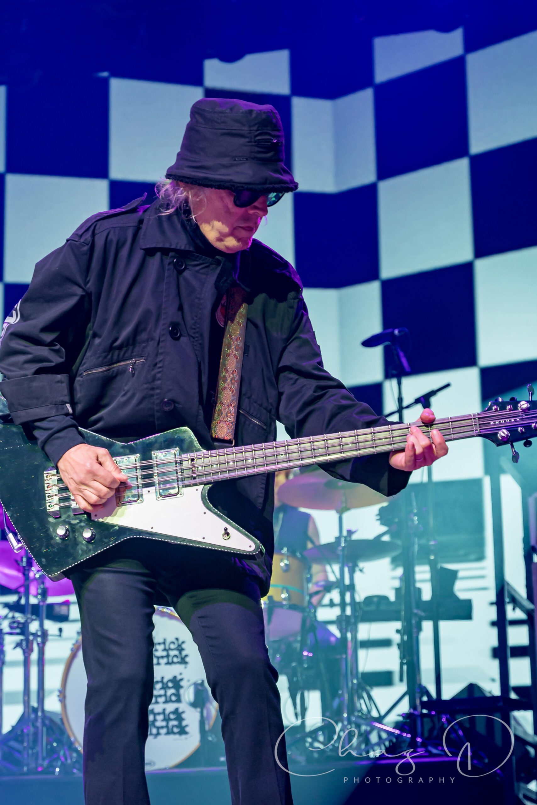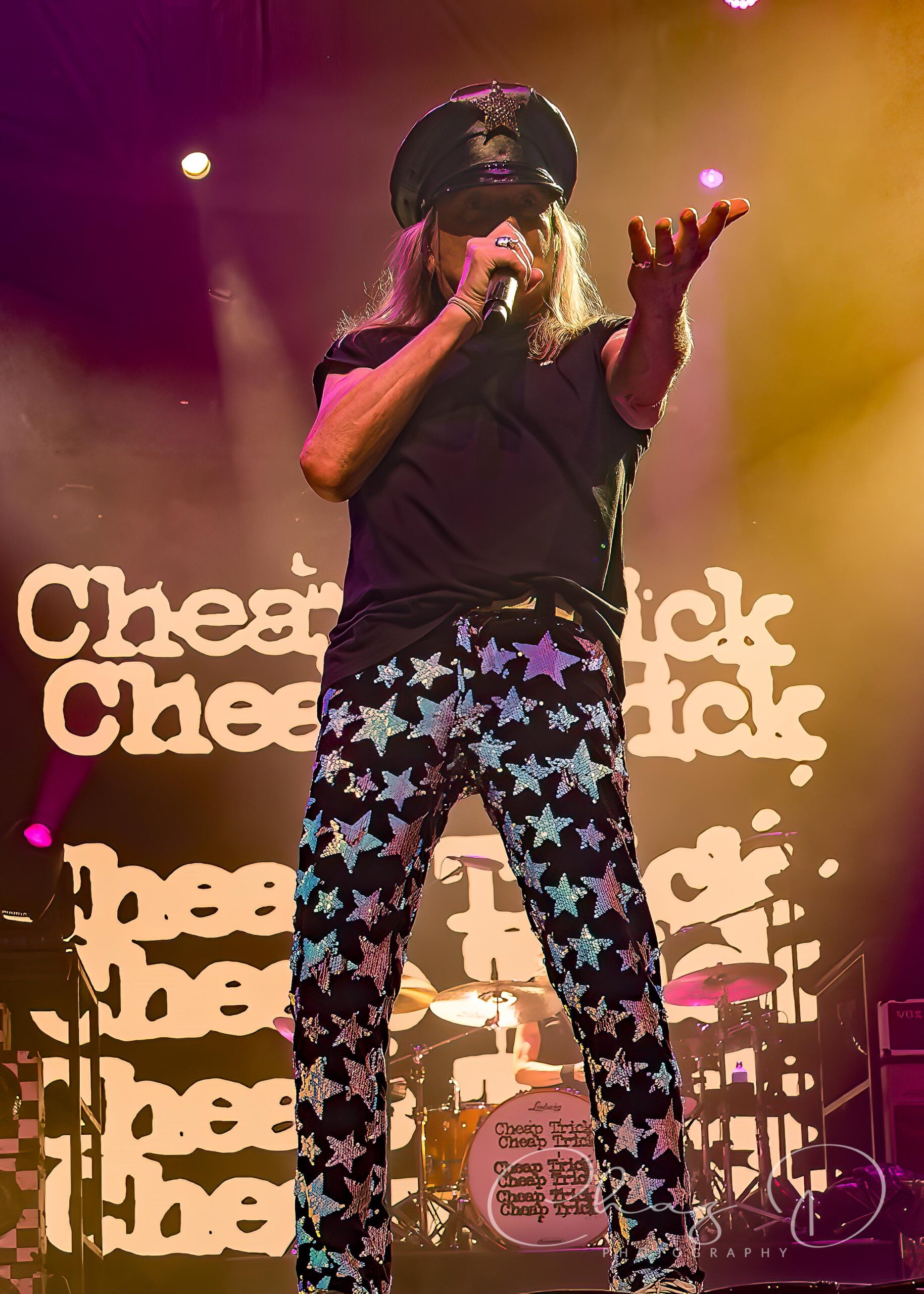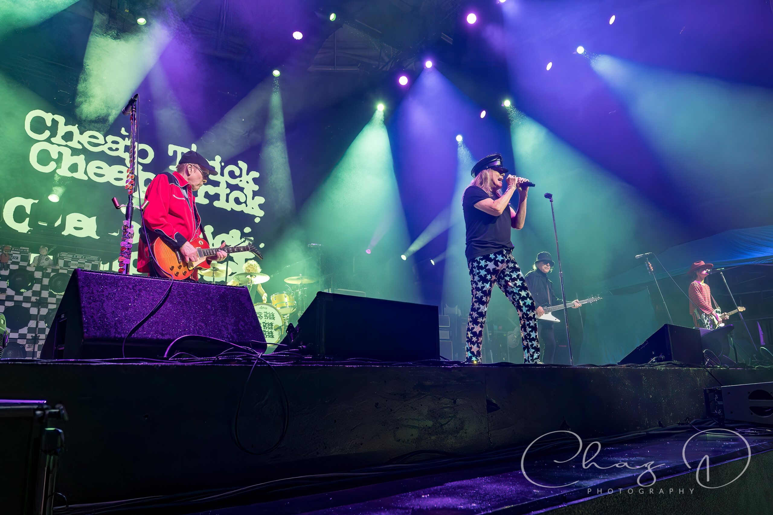 The stage was slick, the crew hustled with towels and blowers, and the start time of 7pm got pushed back just long enough for everyone to check their radar apps once or twice more. But when Cheap Trick finally walked out, the drizzle suddenly felt more like atmosphere than inconvenience. About twenty minutes into their set, almost on cue, the rain eased up and the crowd let out a cheer, mostly from the Lawn Folks. In his star emblazoned pants, the man of 1,000 voices took center stage, and as if to taunt the weather, he sang with might “Oh I can’t stop the music…” as they tore into “Stop This Game”. The 73 year old Zander sounded fantastic, strong, clear, and completely unfazed by the damp conditions. Having his son, Robin Taylor Zander, backing him up added a cool generational punch to the harmonies, and you could feel the Zander chemistry was locked in. In burgundy stripes, both horizontal and vertical, with a pimp fedora to match, the younger Zander, (I call him Z) is indeed “Cheap Trick’s secret weapon” as penned by Rolling Stone magazine. He backed his father up on vocal duties, and between rhythm guitar blends he even supported Rick Nielsen on lead parts. Albeit stealth and seamless, he’d even turn away from the audience so as not to detract from Neilsen’s stage presence, while filling in a lead here and there. The aforementioned Neilsen presence, you know, the guitar swinging, leg kicking and monitor jumping, are now a thing of the past. Don’t get me wrong, Nielsen still played the mad scientist, flashy guitar changes, pick slinging and hamming it up, but you could see the miles on him. The swagger’s intact, the stage sprinting maybe not so much. But 50 years on the road and at 77, we should all be so lucky to be in his custom bedazzled sneakers.