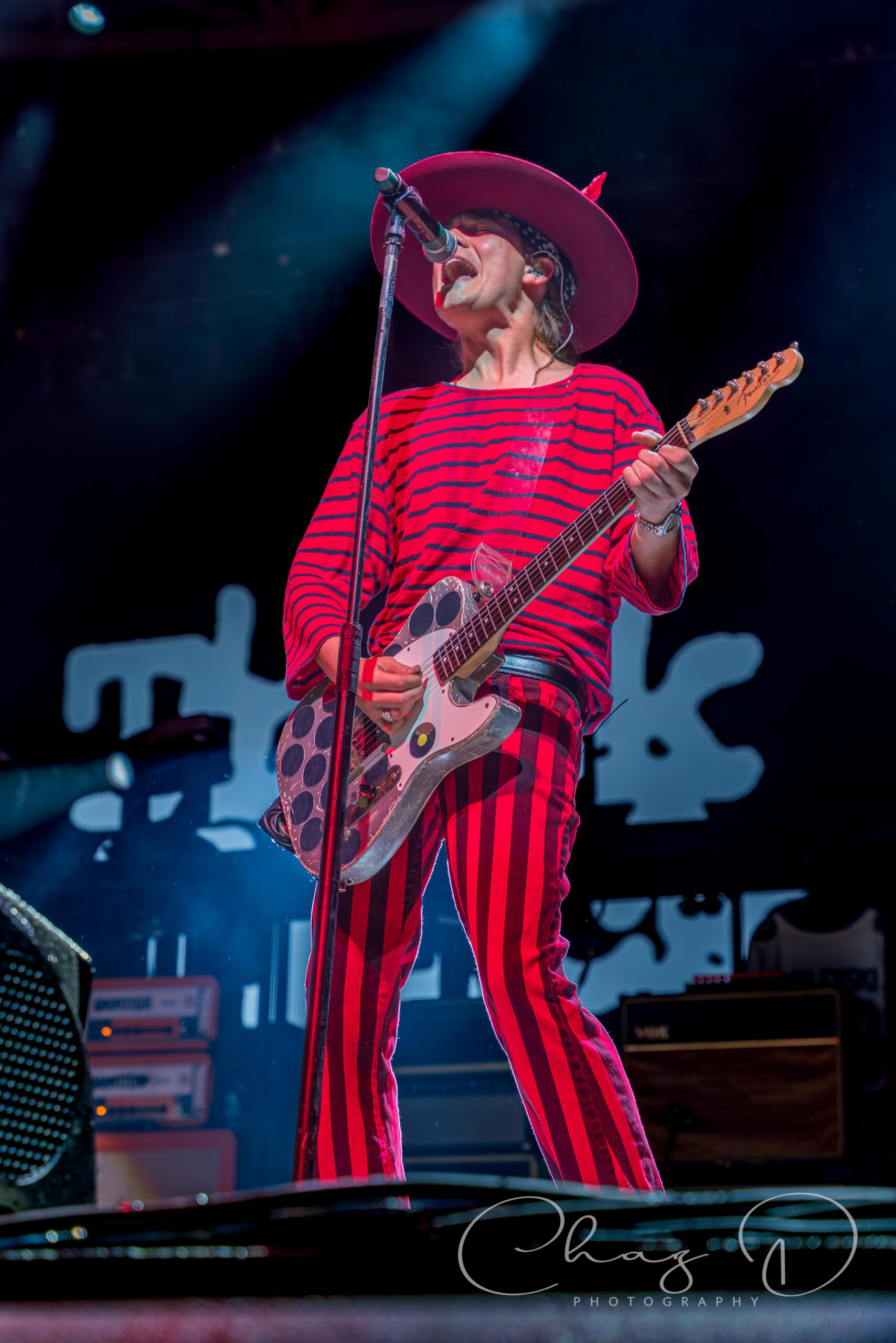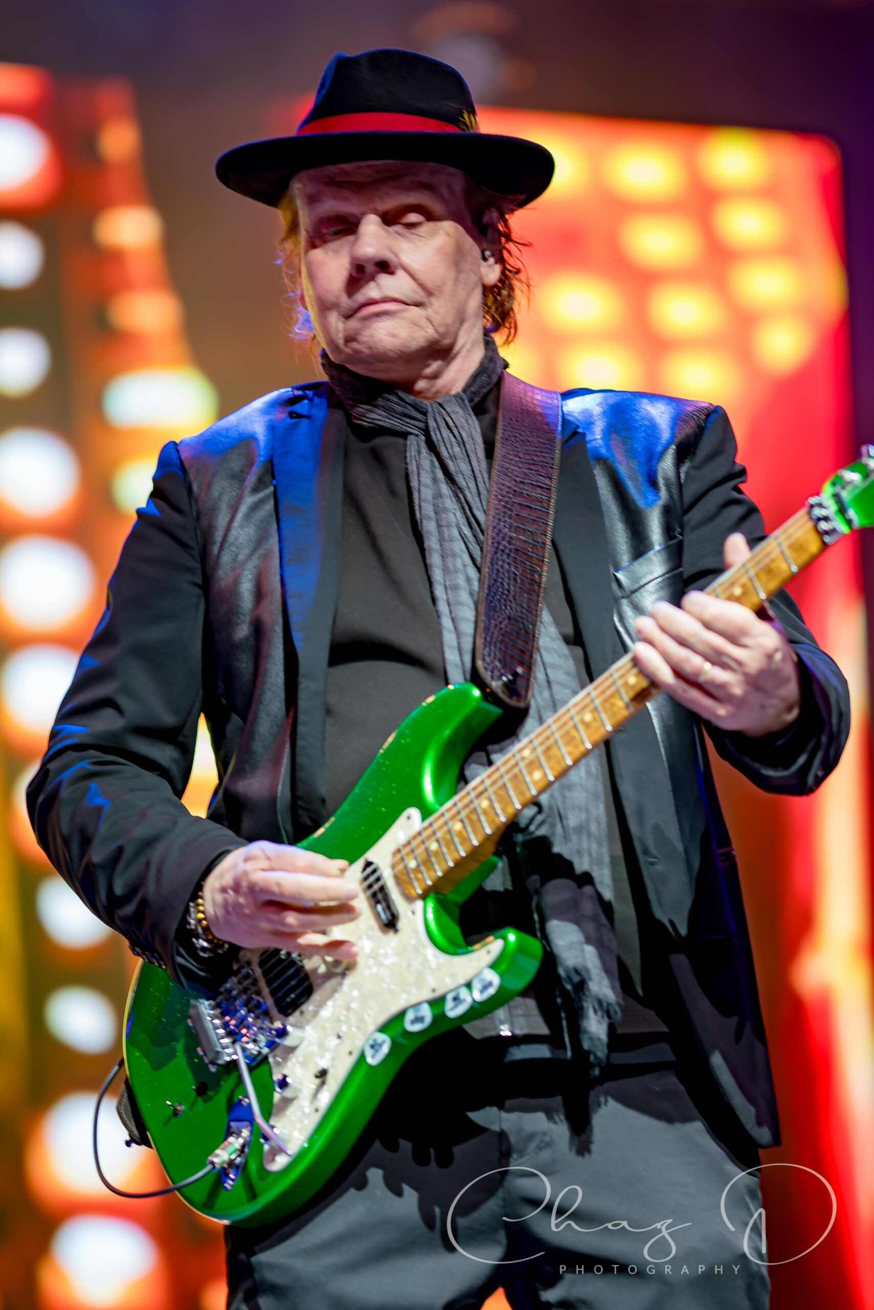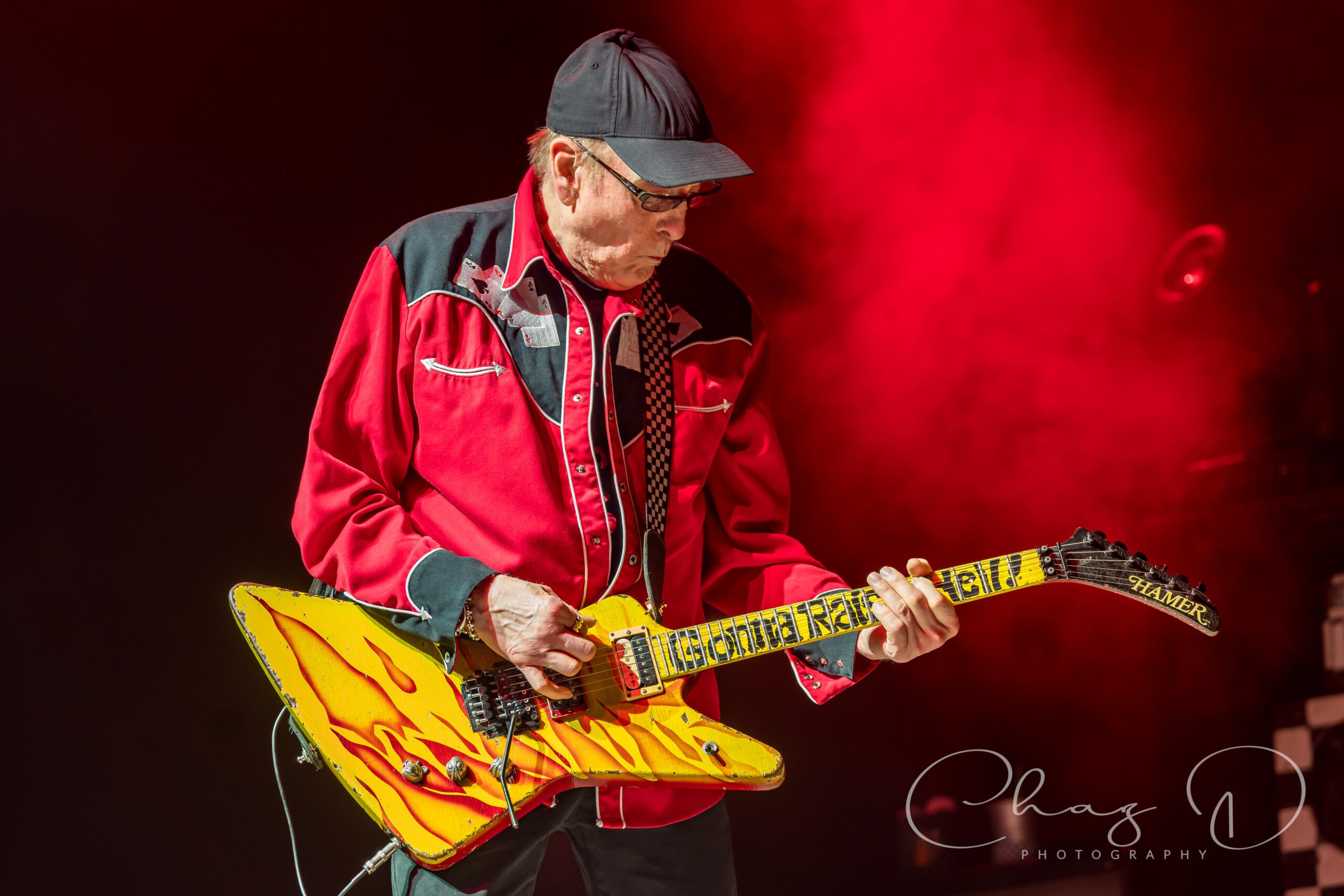 The stage was slick, the crew hustled with towels and blowers, and the start time of 7pm got pushed back just long enough for everyone to check their radar apps once or twice more. But when Cheap Trick finally walked out, the drizzle suddenly felt more like atmosphere than inconvenience. About twenty minutes into their set, almost on cue, the rain eased up and the crowd let out a cheer, mostly from the Lawn Folks. In his star emblazoned pants, the man of 1,000 voices took center stage, and as if to taunt the weather, he sang with might “Oh I can’t stop the music…” as they tore into “Stop This Game”. The 73 year old Zander sounded fantastic, strong, clear, and completely unfazed by the damp conditions. Having his son, Robin Taylor Zander, backing him up added a cool generational punch to the harmonies, and you could feel the Zander chemistry was locked in. In burgundy stripes, both horizontal and vertical, with a pimp fedora to match, the younger Zander, (I call him Z) is indeed “Cheap Trick’s secret weapon” as penned by Rolling Stone magazine. He backed his father up on vocal duties, and between rhythm guitar blends he even supported Rick Nielsen on lead parts. Albeit stealth and seamless, he’d even turn away from the audience so as not to detract from Neilsen’s stage presence, while filling in a lead here and there. The aforementioned Neilsen presence, you know, the guitar swinging, leg kicking and monitor jumping, are now a thing of the past. Don’t get me wrong, Nielsen still played the mad scientist, flashy guitar changes, pick slinging and hamming it up, but you could see the miles on him. The swagger’s intact, the stage sprinting maybe not so much. But 50 years on the road and at 77, we should all be so lucky to be in his custom bedazzled sneakers.