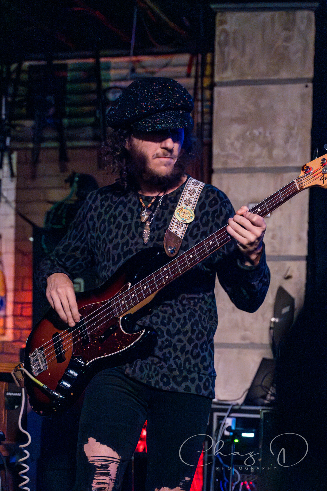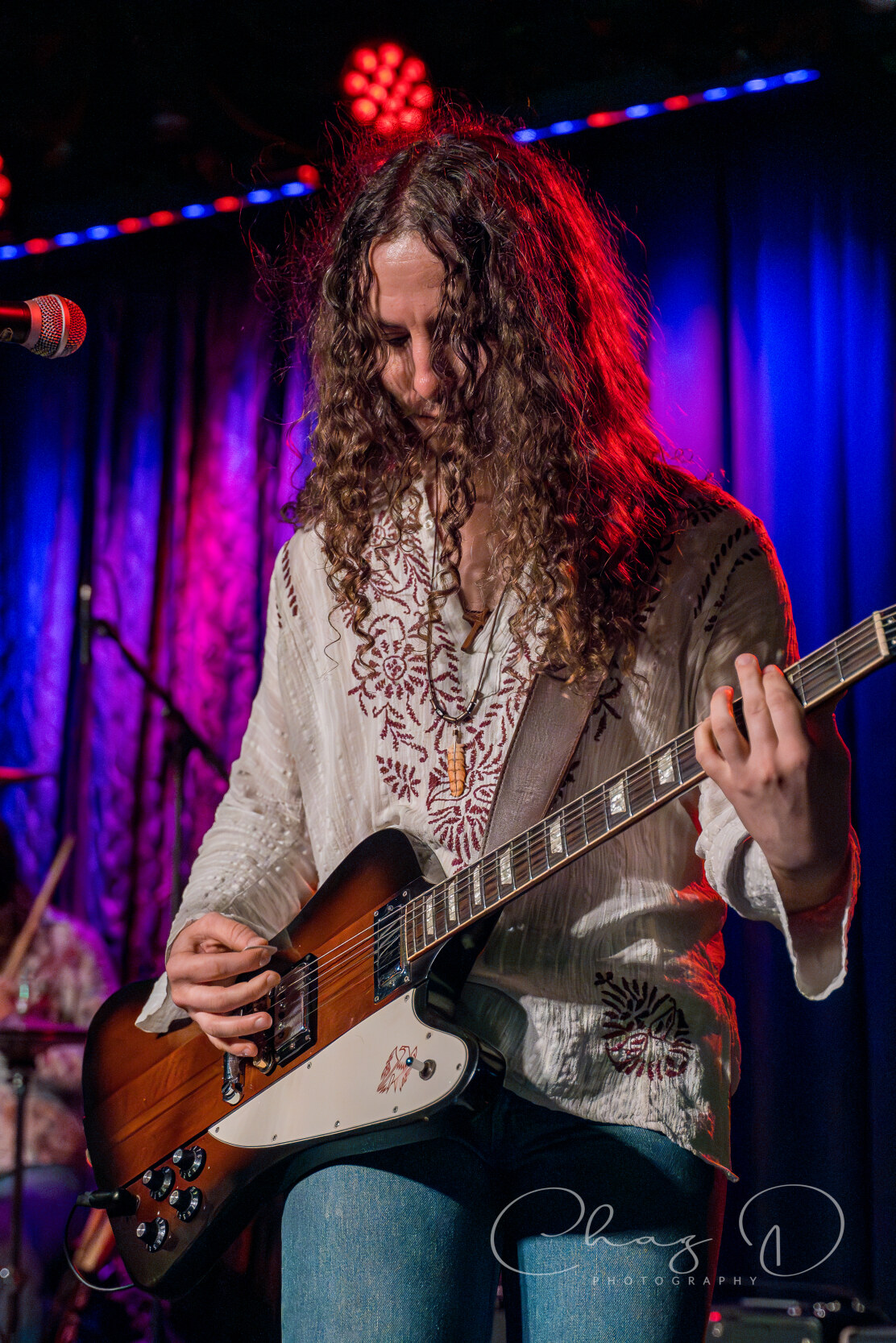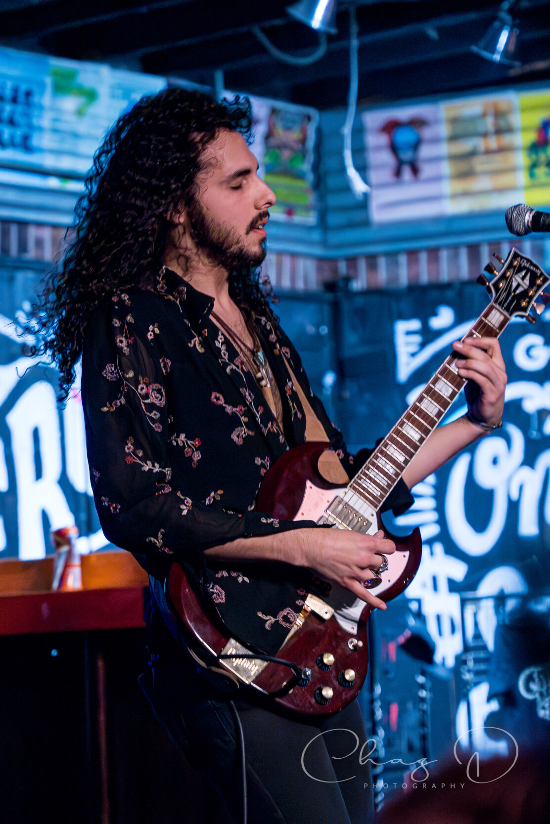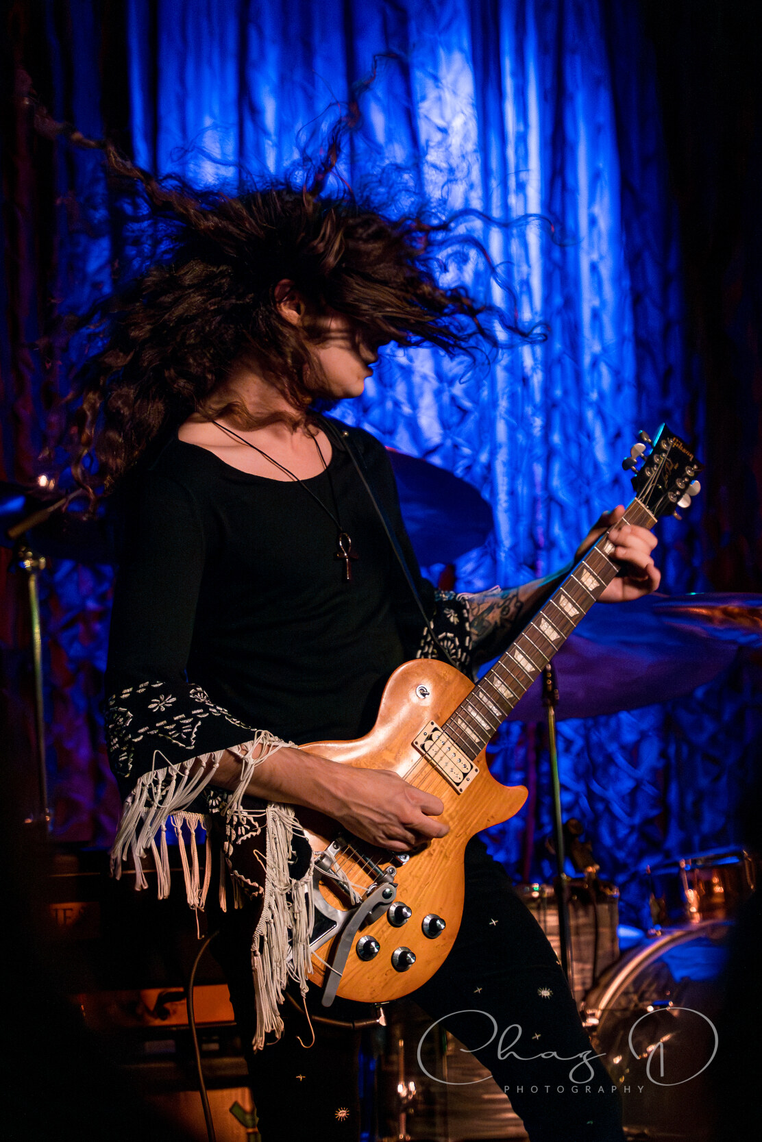 Next up were local favorites The Dirty Janes, who brought their grittier, more blues-infused classic rock sound to the Crowbar stage. Their set was marked by high-energy originals and the commanding presence of their lead vocalist and guitarist Nik Wilson, who always gives each song a sense of urgency. Wilson, in skintight black bell bottoms and fringed shirt, punished his Les Paul, all while belting out heartfelt lyrics from underneath his giant mane of hair. I use the term “punished” not only because of his impressive guitar prowess, but also because he closes out the majority of their sets by using his Gibson as a makeshift towel on his backside. Guitarist and backup vocalist Brandon Chacon, in all black attire also flung around his equally impressive coif, covered a majority of the stage with weathered Strat in tow.