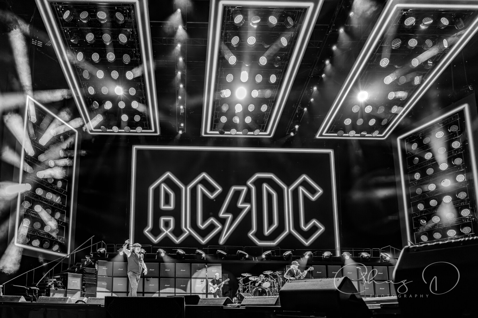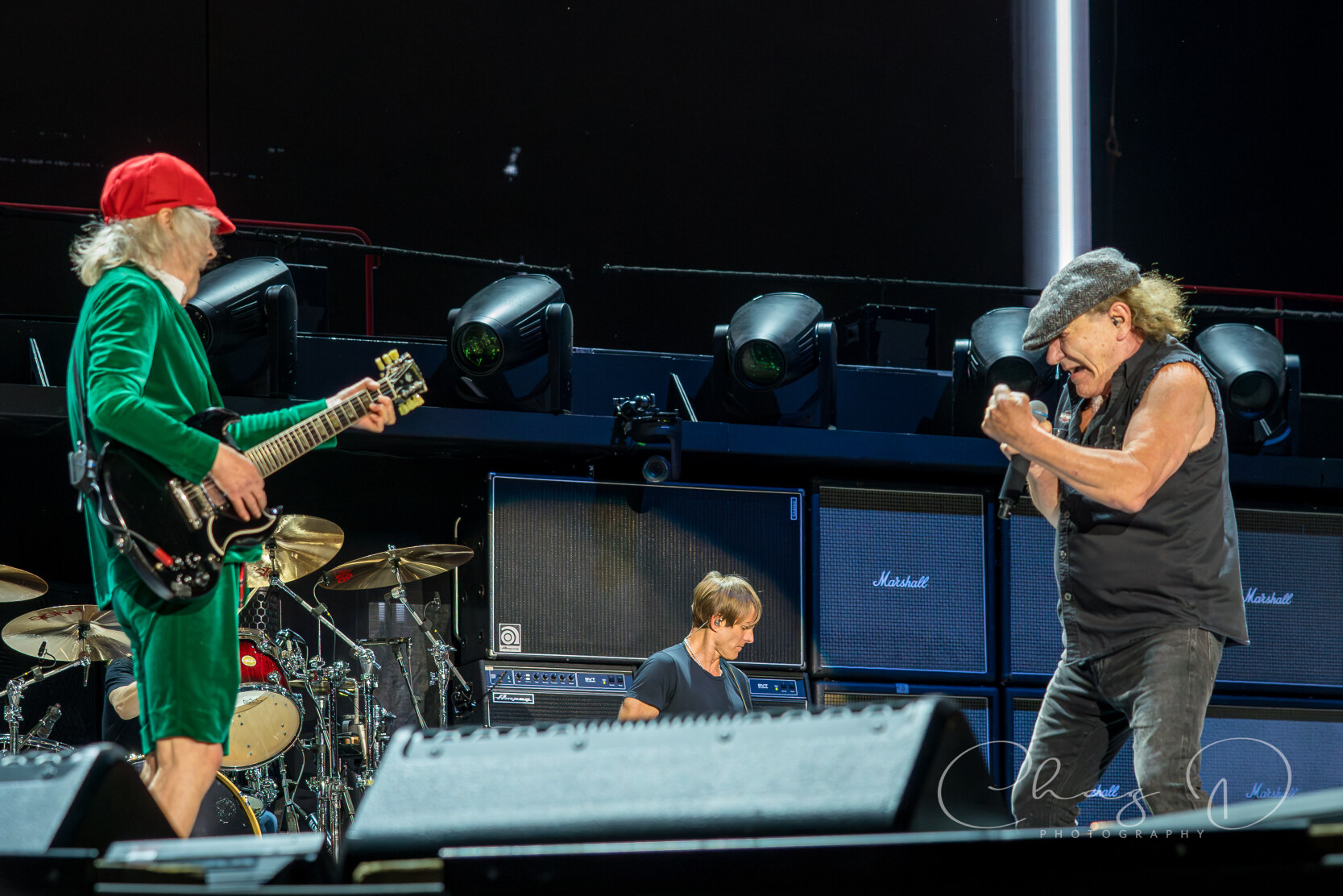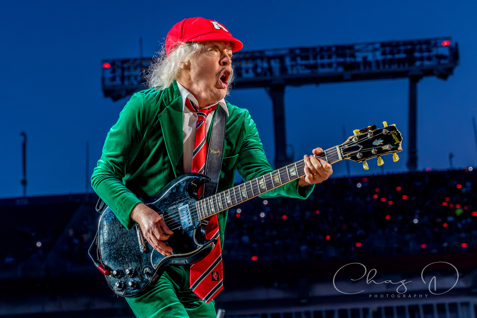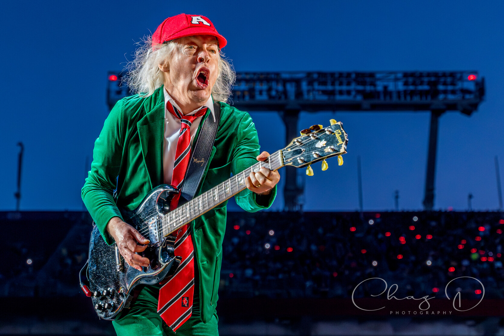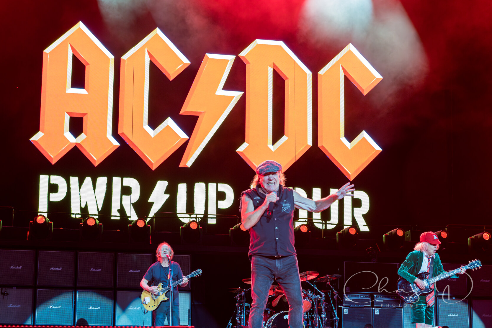 Under the warm Florida night on May 16, 2025, AC/DC detonated Raymond James Stadium with the kind of no frills, high voltage rock show that made their legend. Seventy year old Angus Young—still schoolboy suited—whipped across the stage in endless duck walks, peeling off solos during “Thunderstruck” and “Shoot to Thrill” as if four decades hadn’t passed. At center mic, 77 year old Brian Johnson’s gravel edge howl sliced through the humid air, rallying 60,000 fans on every chorus of “Back in Black” and “Hells Bells.” The production stacked towering amps against a wall of LED screens, showering the crowd in strobes while the rhythm section hammered each riff with locomotive precision.
